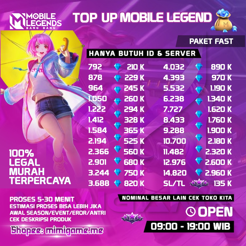 Top up ML. Select the Diamond denomination. Untuk Mempermudah Pembayaran Anda Disini Kami Juga Menyediakan Metode Pembayaran Alfamart Bank BCA Bank Mandiri Bank BNI Bank BRI DANA OVO Gopay Shopee Pay Link Aja dll. Dan rasakan kemudahan Top Up Mobile Legends Bersama Fast Gaming Store.